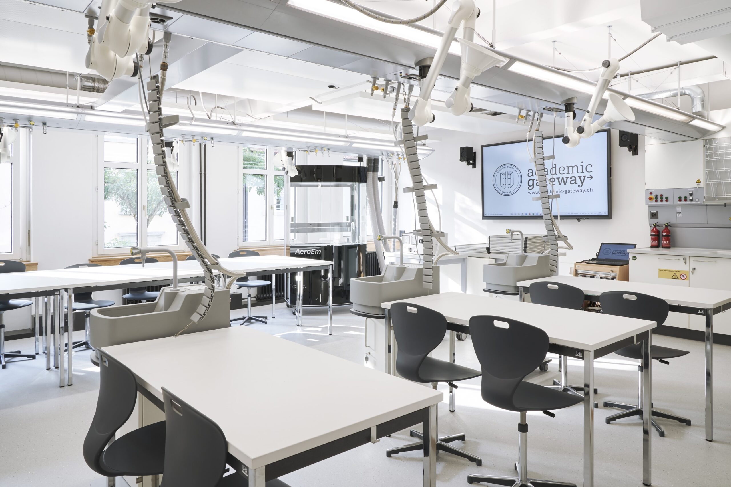 Umbau, 2021Moderne Schulräume innerhalb eines bestehenden Gebäudes an der Löwenstrasse Zürich auf mehreren Geschossen mit Vorlesungsälen, Cafeteria, Experimentierräume und Ausstellungsflächen.